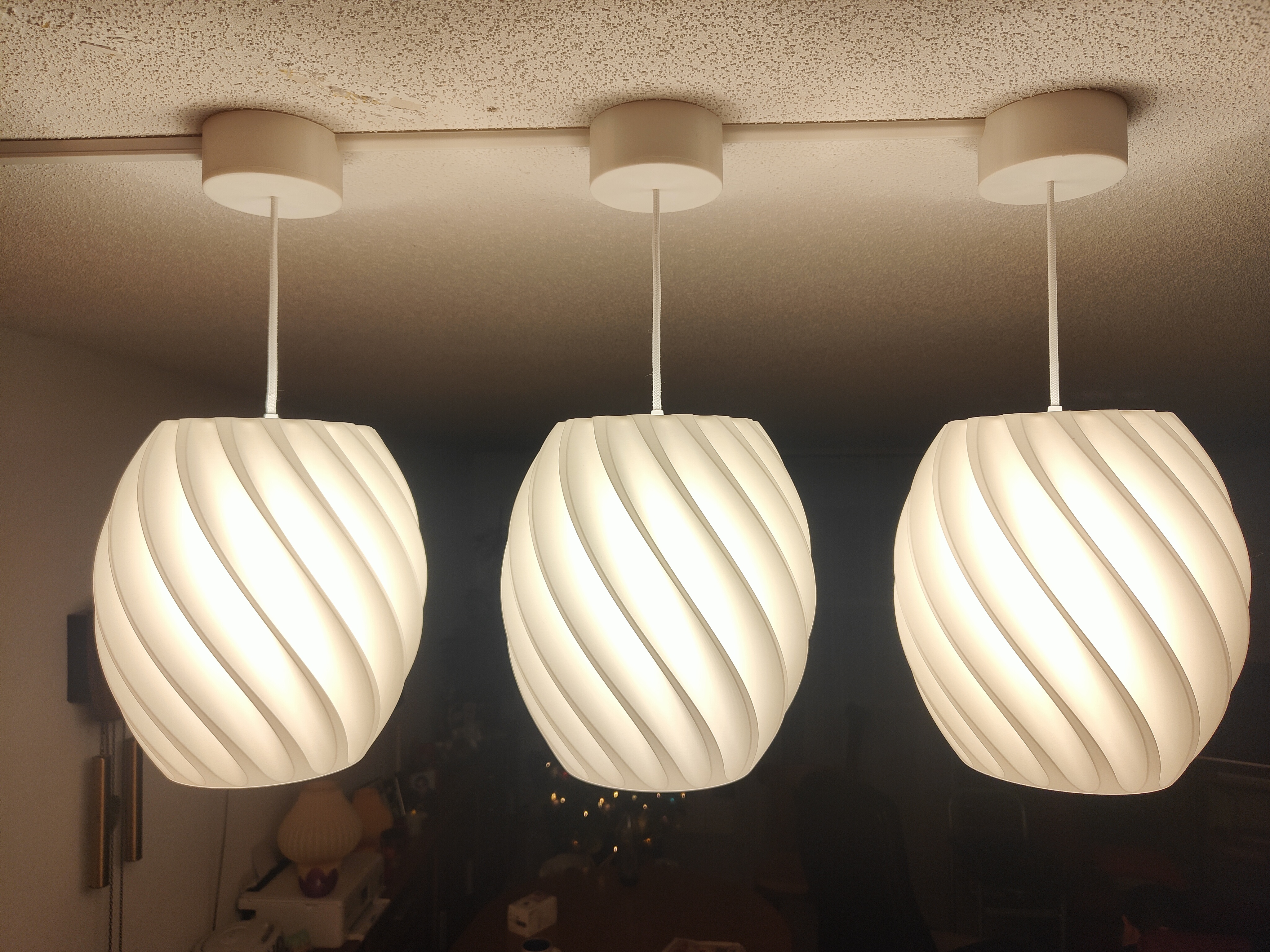 Atmosphärisches Lichtspiel: Im eingeschalteten Zustand entwickeln die Schirme eine faszinierende Tiefe. Besonders die weisse Variante sorgt für ein warmes, diffuses Licht, das die feine 3D-Struktur wunderschön betont.